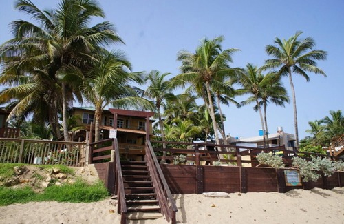 Our beachfront estate apt has a full kitchen equipped with microwaves, stove, oven, toasters, coffee pot, etc. The apartment is set up for 4 guests but can accommodate 5 (if families). The apt has a living room with a pullout futon, TV, ceiling fans and opens onto your own private balcony which overlooks/joins the beachfront courtyard and Sandy Beach. Each bedroom has a split unit AC's and ceiling fans. 2 small beds are in one bedroom and a large bed in the master along with a futon sofa in the living room.