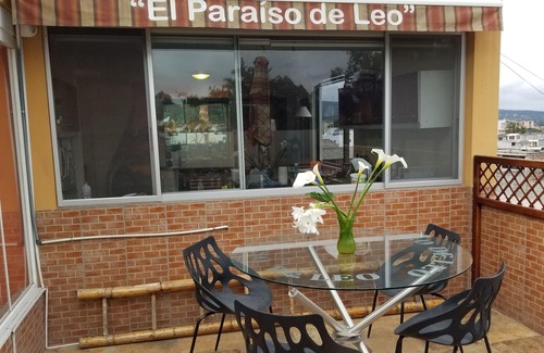 Penthouse on the top 3rd floor with terrace, jacuzzi, electric heater, view of the volcano and with unobstructed surrounding mountains, 9,000 feet high, clean air, temperature daytime 75 F and 55F at night. It has a large terrace with a large glass table for breakfast, an umbrella with two sunbathing chairs and remote-control sun cover. Large sunroom has panoramic unobstructed views with large windows. Property has a 65 inches HD TV, Netflix, Bosch speakers, local and US phone (free calls), laundry service pick up and delivered, cleaning service, modern kitchen with many types of equipment. No gas, induction oven and cooking dishes, office desk wired for laptop wi-fi, fireplace, modern furnishings with well-appointed design. Property right in a center of town, next to Pichincha Bank. The bed and pillows are memory foam. Property has all the comfort for comfortable living and live there permanently. The good reason it has name Leo's Paradise. See many pictures and imagine staying there. Penthouse located in Cotacachi, Ecuador. Only long-term lease 6 months and longer, $28/night. Contact by email: russell2000futures@gmail.com, US phone: 678-935-7905
