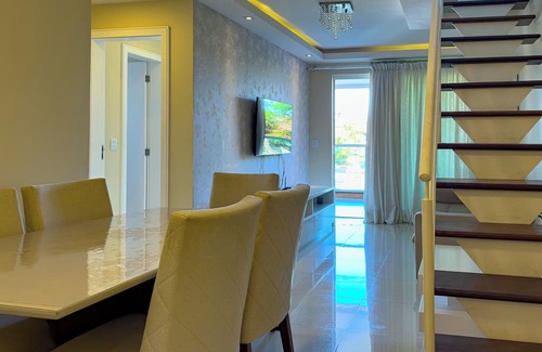 This 3-bedroom apartment is perfect for your escape to Cabo Frio. The bedrooms feature 2 queen beds and 1 twin bed,Uma cobertura com piscina e area gourmet, ensuring a comfortable stay for all guests.