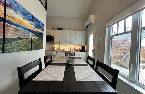 There is a beautiful table for 4 to allow for hosting dinners or playing one of the selection of games provided, with friends. There is a full kitchen (minus an oven) with stove, microwave, fridge, freezer, cutlery, plates & dishes, pot & pans, cutting boards, etc. And there is even a dishwasher to make the clean up easy! We've also provided a Keurig coffee machine with easy single serve coffee pods and cream and sugar to ensure you have a fantastic cup of coffee when you rise in the morning. We have also provided a re-fillable Keurig coffee pod if you prefer to avoid the single use coffee we have available; so please feel free to bring your own coffee to reduce waste.