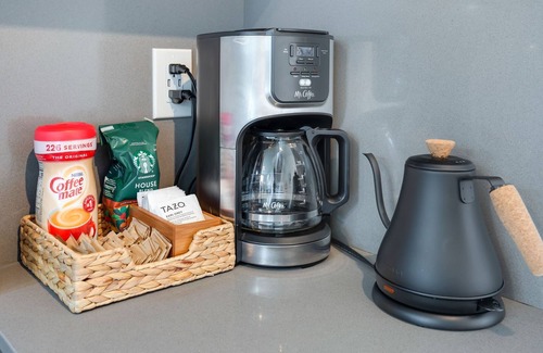 • Kitchen is stocked with a full range of kitchen appliances, cookware, silverware, servingware, spices, keurig coffee & tea