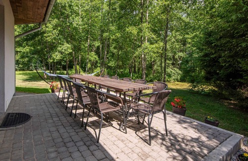 4-room house 120 m2 on 2 levels. Open living room 40 m2 with 1 sofabed, open-hearth fireplace and TV. Exit to the terrace. 1 room 17 m2 with 2 double sofabeds and shower/WC. Kitchen 18 m2 (4 hot plates, oven, dishwasher, microwave). Upper floor: 2 rooms 12 m2, each room with 2 double sofabeds and shower/WC. Wood heating (extra). Terrace 20 m2. Terrace furniture, barbecue (portable). Facilities: washing machine, logs (extra). Parking at the house. Please note: smoke alarm.