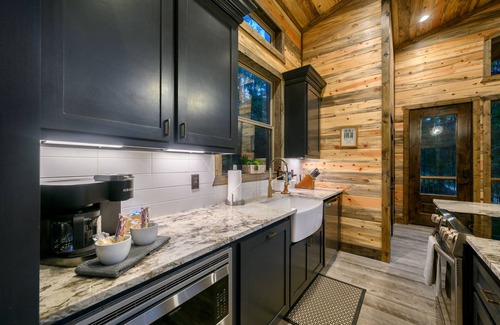 Kiss Me in the Dark is nestled in the pine trees of Eagle Mountain in Hochatown. Privately owned and operated by Almost Heaven Luxury Cabins, LLC, this beautiful cabin is perfect for a romantic getaway with one king bed and one bath or for a small family (air mattresses provided). Situated on the side of a hill, you have the feeling of almost being in the trees! Kiss Me in the Dark is located just minutes from everything Hochatown has to offer yet secluded enough to get away!