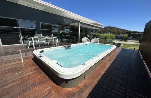 The generous, open-planned living area spills onto a covered entertaining deck, which includes a heated swim spa, outdoor fireplace, swing seat and sofa.