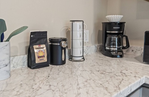 Through a private entry, step into the upper level to find a bright and airy living space filled with natural light. The open-concept layout includes a fully equipped kitchen, perfect for whipping up delicious meals that can be enjoyed at the dining area adjacent to the kitchen. The spacious king bedroom offers a plush, restful retreat with calming decor. The queen room offers comfort and style. The large bathroom boasts modern fixtures for a contemporary feel. You’ll also enjoy the added convenience of an in-unit washer and dryer, making it easy to take care of laundry during your stay.
