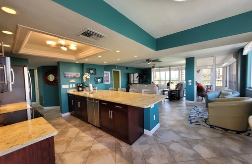 Relax in a comfortable well-equipped luxurious 4th floor unit with an open floor plan which includes a spacious living room, three flat-screen TVs, internet, cable, two full baths, laundry room with washer, dryer, iron, iron board and dryer, electric hurricane shutters, extra refrigerator, dining area, breakfast nook, and a fully stocked open kitchen with an illuminated tray ceiling and breakfast bar. Both bedrooms offer walk-in closets and private terrace access.