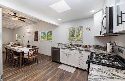 Enjoy sun-soaked days lounging by the sparkling private pool, grilling under the covered patio, or unwinding in the bright, open-concept living area featuring vaulted ceilings, comfy sofa and love seat, and a 72" Smart HDTV. The sleek chef’s kitchen with granite countertops, stainless appliances, and all the essentials for home-cooked meals.