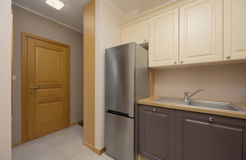 The apartment is decorated in bright, warm colors, with attention to detail and functionality, creating a cozy, homely atmosphere. The living room has a sofa bed that can serve as an additional place to sleep. A TV with cable channels and a Smart TV function is hung on the wall, allowing you to use popular streaming services. The focal point of the living room is a functional table, which is perfect both as a place to eat meals and as a space to work or relax. The kitchen is fully equipped to ensure comfort when preparing meals. Guests have access to an induction hob, toaster, capsule coffee maker, fridge with freezer, electric kettle, microwave and blender. The bedroom has a comfortable double bed, guaranteeing a peaceful and comfortable sleep. There is also a desk with a chair in the room, which creates a peaceful place to work or study. A large, spacious wardrobe allows for convenient storage of clothes and will be perfect even for longer stays. The bathroom has been designed with comfort and aesthetics in mind – it is equipped with a spacious shower, a sink with a large mirror and a washing machine, which is an additional convenience for guests. The whole creates a harmonious space, conducive to relaxation and everyday comfort.