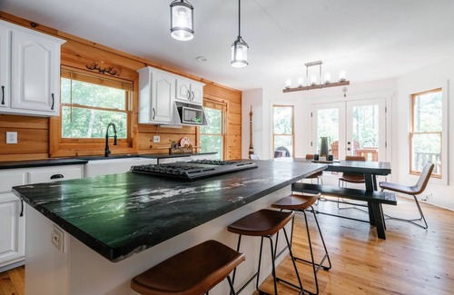 - Modern Kitchen: Discover a fully stocked chef's kitchen with new soapstone counters, stainless steel appliances, and a welcoming coffee bar (starter coffee/tea and S'mores kit included!).