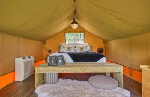 The glamping tents offer a queen-size bed for a romantic stay. The farm offers Wi-Fi, and heated and air-conditioned shared spaces. You are provided with linens, towels, and bathroom products for a luxurious stay.