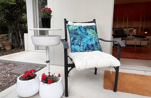 There is an outdoor dining area with 4 chairs and a table as well as a lounger with cushions. A small gas Weber Q - BBQ unit is located in the Alfresco as well with cleaning equipment under the BBQ in a cupboard. Courtyard is secure, screened with a well-maintained hedge. Directly opposite the street there is a great park. I hope you will enjoy it as much as I do walking my dogs.