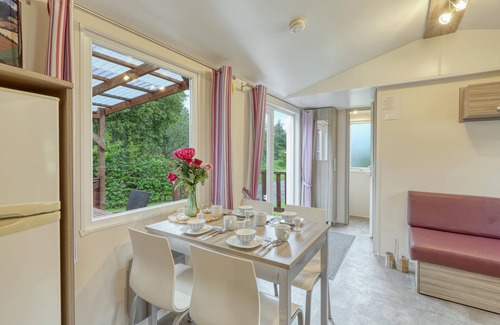 The house welcomes its guests in a beautiful location on a campsite near the forest. Use it as a cosy base for a wonderful break with explorations of the surrounding area and experiences in nature. Enjoy a beautiful view of the outdoors as soon as you wake up, settle down in the cosy rooms after your excursions and make plans for the days ahead while relaxing in the attractive living area.