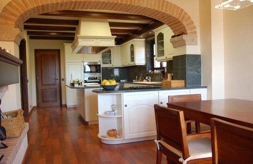 This accommodation with a fantastic view of the valley, has 5 bedrooms (two suites with double bed and bathroom, 1 bedroom with double bed, 1 bedroom with two single beds, 1 bedroom with 3 single beds and bathroom, 1 folding bed) 3 bathrooms (2 in the suites, with bath and shower), 2 bathrooms with shower, and a wide list of additional services and amenities: