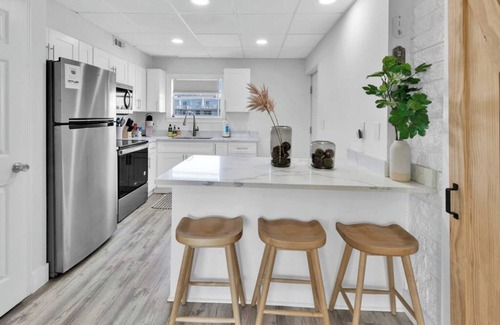 Step inside and be greeted by a full kitchen with stainless steel appliances, stone countertops, and a breakfast bar with seating for two. You'll have everything you need to cook up a delicious meal, from cookware to a single-use Keurig with K-cups, creamer, and sugar.