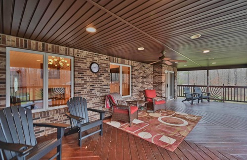 Meticulously maintained "Mansion" sleeps up to 30 with 11 bedrooms and 6.5 bathrooms on 10 acres. The "Mansion" is surrounded by plush landscaping and secluded surroundings for your privacy. There is both a main house and a guest house. The main house consists of 7 bedrooms and 4.5 bathrooms with over 5000 square feet of living space. The guest house has an additional 2000 square ft, which includes 4 bedrooms and 2 baths and is perfect for guests, privacy, or hired help. There are many amenities including 4 smart TVs, a hot tub, a sauna, a game room including workout equipment, a built-in bar, a pool table, and a Foosball table. Outside there is a private pond for fishing, a pavilion with a fireplace, a newly added Pickleball court, a basketball court, a home theater room, a putting green, and a fire pit. We have recently installed a private Tesla charging station free for all guests!
