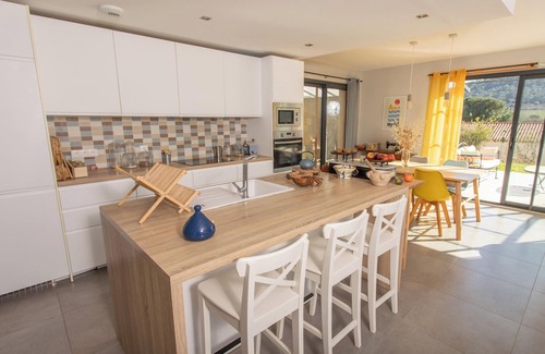 Located in the picturesque village of Pierrefeu-du-Var, in the heart of the Maures mountain range, this contemporary 100 m² villa, beautifully decorated, is the perfect choice for a family vacation with two children or for two couples.