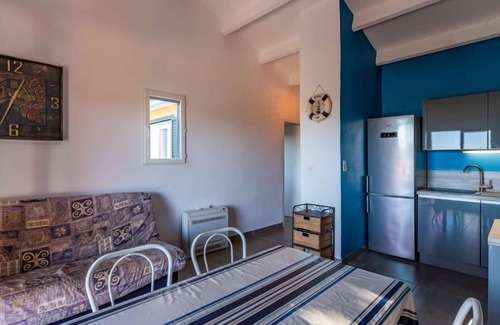 3-room house 82 m2 on 2 levels. Comfortable and beautiful furnishings: living/dining room with 1 sofabed (120 cm, length 190 cm), TV (flat screen). Exit to the terrace. 1 room with 1 french bed (140 cm, length 190 cm). Open kitchen (oven, dishwasher, 3 induction hot plates, toaster, kettle, freezer, electric coffee machine). Exit to the terrace. Shower/WC. Electric heating, air-conditioning. On the lower ground floor: (exterior staircase), 1 room with 1 french bed (140 cm, length 190 cm), shower/WC. Exit to the terrace. Air-conditioning. Beautiful view of the sea. Facilities: washing machine. Internet (WiFi, extra). Parking (2 cars). Please note: non-smoking house. Smoke alarm. No internal connecting door between the floors.