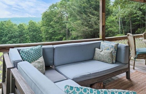 There are two sliding glass doors in the main living area leading out onto a covered deck with lounge seating and an outdoor dining table. There is a Blackstone Griddle for outdoor cooking. The deck overlooks a beautiful view of the mountain.