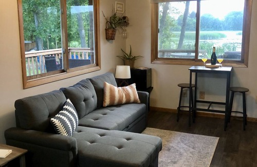 Welcome to @PineLakeLodgeMN, a kid and pet friendly (fee) cabin located only one hour from the Twin Cities on Pine Lake. Includes access to a huge game room and theater. This is the perfect getaway from the hustle and bustle of city life, as well as a great spot for all things outdoors such as ice fishing, hunting, snowmobiling, snowshoeing, sledding and more! We're just across the way from East Rush Lake and minutes from downtown Rush City. Come and watch the sunset from your private deck while you relax at this cozy little cabin! Please note, Pine Lake is a small, shallow lake for non motorized watercraft (which we provide). Fishing is not productive, but it’s great to take the boats out and have fun. There is great fishing across the street on East and West Rush Lake. Swimming is also not advised due to the abundance of lily pads and cattails. There are many options for swimming nearby if that is of interest.