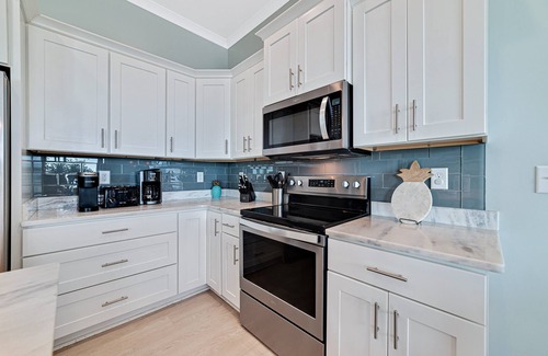 Each level features wide porches with breathtaking Gulf-front views, providing plenty of space to unwind and take in the scenery.