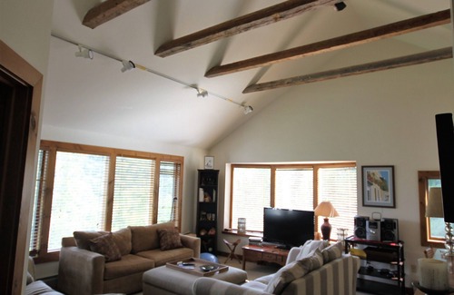 With high ceilings and tall glass, this lofty apartment has fantastic views of the Pinnacle and Worcester mountain range. Located only minutes from Stowe Main Street and the Ski Hills of Mt Mansfield and Spruce Peak, this private location is perfect for a long weekend or longer. A self contained space, with king master bedroom, large living room with queen sofabed, full kitchen and separate dining area, this makes for a very relaxing location. See listing 899259 linked to this apartment and available to sleep a total of 18 people (house and apt).