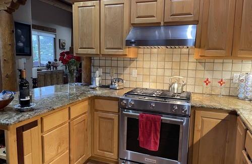 The home is a custom built, split-level Santa Fe Style home with 12 foot latillas & vigas ceilings, kiva fireplace, and saltillo tile and brick floors throughout. There is a covered Portal for relaxing, outdoor fire pit, and huge windows for taking in the big mountain views. The home has an open plan with contemporary furnishings and outstanding art and sculptures purchased from local artists and galleries. This is no ordinary rental, but a stylish, beautifully furnished personal home filled with quality furnishings, art, and treasures