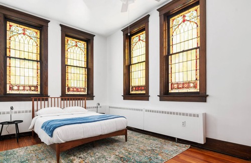 Spacious two bedroom space located in the heart of Winchester. It’s within walking distance to the movie theater, library, shopping and a variety of local restaurants. If you are a race fan, the World’s Fastest Half Mile, the Winchester Speedway, is just outside of town. This is a great place to enjoy a quiet small town, but has an easy drive to nearby cities. The space is part of a beautiful, old church that has been renovated. Features include free parking, WIFI, separate shower/bathroom, fully equipped kitchen and a spacious living room.