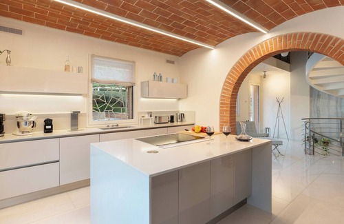 Podere Terranuova is a beautifully restored farmhouse located in the green hills near Peccioli, Tuscany. Combining traditional Tuscan charm with modern luxury, this property offers elegant interiors, lush outdoor spaces, and breathtaking views of the countryside. Vaulted brick ceilings, exposed beams, and luminous marble create a refined yet welcoming atmosphere. The property includes a main house and a charming annex, providing privacy and comfort for larger groups. Surrounded by manicured gardens and enhanced by artistic bronze sculptures, Podere Terranuova is ideal for families or friends seeking relaxation and conviviality in a luxurious setting.