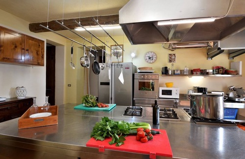 Laid out across two floors, the villa's eight bedrooms are individually styled while Tuscan in design - original features include terracotta flooring and restored frescoes. Despite accommodating so many guests, privacy is not compromised - five bedrooms in the main house have en-suite bathrooms, and there are three spacious living areas, furnished with comfy sofas. On the ground floor there is a well-equipped kitchen and a dining room, framed by stone arches and with a huge table, can cater for large communal meals. Outside, the terrace is furnished with a pergola, table and Pizza oven, barbecue, with great views of the surrounding countryside.