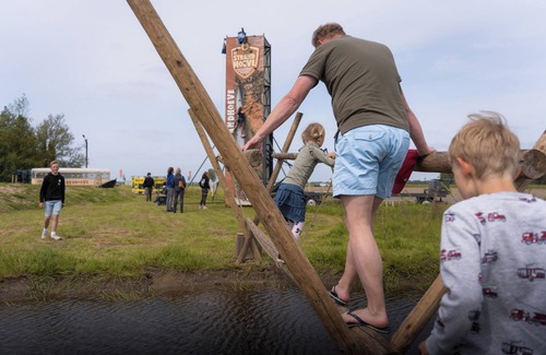 Next to the seating area, there is a cozy bar with a beverage fridge and a tap system. Step outside onto the partially covered terrace, overlooking the large climbing frame. Beyond the fence, you’ll find the expansive 2-hectare recreation area, complete with a campfire spot, football field, volleyball net, and various play ponds.