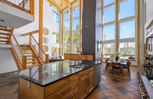 The fully equipped kitchen boasts modern appliances, including a refrigerator, stove/oven, dishwasher, and microwave, along with all the necessary dishes and utensils for your culinary adventures. Enjoy meals together at the dining table or take them outside to the deck for al fresco dining with breathtaking mountain views.