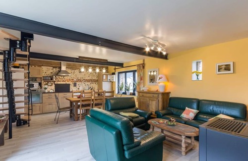House adjoining the cottage 4 people G1409: Ground floor : Large living room with: - living room / lounge (flat screen TV, pellet stove), - fitted kitchen (oven, microwave, freezer, vitroceramic hotplates), - double room (1 double bed 160x200cm), - shower room with wc (washing machine), 1st floor : - 1 bedroom for 2 people (1 bed 160x200cm), - 1 room 3 persons (3 beds 90x190cm), - Bathroom with toilet, - small landing room (office). Heating: pellet stove + electes rooms. Mixing old and contemporary, you will be seduced by the quality of the renovation of this Norman farmhouse made by the owners. The building is located in the center of the village, close to small shops and 20 minutes walk from the beach. The building is divided into 2 gites (G1408 and G1409) that can accommodate 11 people in total: ideal for family or friends with complete independence. Private garden. Rest, tourist discovery of Normandy, rdonnée: we leave you the choice ....