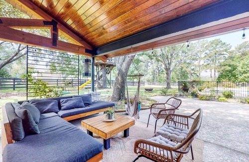 Find tranquility, warmth, and peace of mind when you visit the quaint town of Tomball and this charming home that's perfect for a getaway. With a private pool, hot tub, billiards, and plenty of room for everyone, an unforgettable vacation is in your grasp. Walk to the adorable little town district where you can sample hometown foods, shop at boutiques, and discover small-town charms. For those who love watersports and adventure, Lake Conroe is down the road, or hike the beautiful trails in the woods. After a day full of adventures, come home and relax poolside with an inviting backyard complete for an outdoor barbecue in the outdoor kitchen, perfect for witnessing breathtaking sunsets.
