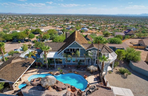 Plan the perfect family getaway at this sprawling vacation rental in Apache Junction. This 5-bedroom, 4.5-bath house offers over 5,000 square feet of living space, a game room, and a poolside paradise in the yard — ideal for beating the Arizona heat. With so much to do at the property, you won't need to go far, but be sure to explore nearby hiking trails or the scenic Canyon Lake before heading home refreshed!