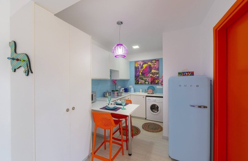 The apartment's colorful decor was conceived with the aim of making its guests happy while firing up their energy and positive vibes' reserves. As lucidly quoted on the main wall's graffiti, it is meant to spoil its tenants.