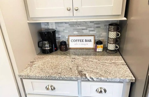 Enjoy a romantic dinner for two in our eat in kitchen area equipped with romantic lighting or sit & enjoy a breakfast meal with some coffee from our complimentary coffee bar. Plenty of counter space will make meal preparation a breeze. Loads of storage space in the cabinets & drawers, which is where you will find utensils, dishes, cookware, etc. Stainless steel appliances throughout. Excellent view of backyard where wildlife such as Deer, Rabbits & local Birds frequently visit. Perfect for keeping an eye on the kids while they play as you prepare lunch.