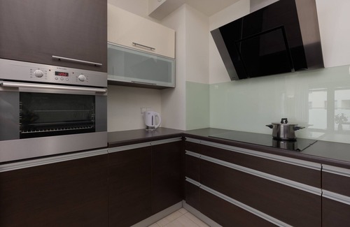 The spacious, modern apartment can comfortably accommodate up to 3 people. The 69 m² area is divided into a living room with a large sofa bed, a kitchenette, a study, a separate bedroom with a double bed and a bathroom with a bathtub. The living area has access to a private balcony equipped with garden furniture - an ideal place to enjoy the sunshine and the view of the surroundings. The apartment provides space for remote working - the study has an adjustable desk with a comfortable chair. The interior is finished in warm colours, with each element creating an extremely cohesive as well as functional space. Lavish furnishings include complimentary Wi-Fi, a TV and full bathroom and kitchen facilities. Complimentary toiletries, towels and bed linen are provided for a good start to your stay. A private parking space is available for guests travelling by car.
