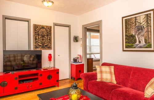 As you settle into this 1-bedroom, 1-bathroom rental, you'll find a living room, a dining area, a sofa bed, and a fireplace. Connect to the free WiFi, or get cozy in front of the Smart TV; there's also video games and a DVD player. Bathroom amenities include a hair dryer, towels, and toilet paper. Prepare a home-cooked meal in the kitchen, complete with an oven, a stovetop, and a refrigerator, as well as a coffee maker, an electric kettle, and a microwave. And thanks to the washer and dryer, you'll even be able to travel light. Other amenities include bed sheets, a desk, an ironing board, and bike storage.