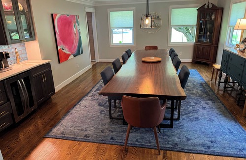 With five cozy bedrooms and multiple living areas, there’s room for everyone to spread out and relax. The large dining room, featuring a table for 10, is perfect for shared meals, game nights, or catching up over coffee. The wet bar makes entertaining easy, while two mini fridges and a 100-pound-capacity ice maker in the mudroom ensure you’re always stocked up on drinks and snacks.