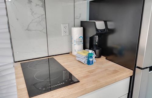 There is a 2 burner electric cooktop, microwave and refrigerator. Please note that there is no oven or dishwasher.