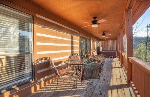 The exterior front offers a carport for your use, and a wrap-around porch that goes from the carport to to the rear of the cabin where the covered porch is located. The rear deck features a covered porch where you can enjoy the rocking chairs and table and chairs for dining out. If you want to enjoy some real R & R, kick back in the bubbling hot tub and soak in the majestic views after a long day of taking in the mountains. There are neighbors on each side, but not too close. We cannot see neighbor sitting on the back porch or sitting in the hot tub, and they cannot see us. You will never have to get out in the rain while staying at our cabin. From the carport you can go directly into the house or take the deck around to the back. From the house you can go directly onto the covered rear porch. No muddy feet or climbing steps at this cabin!
