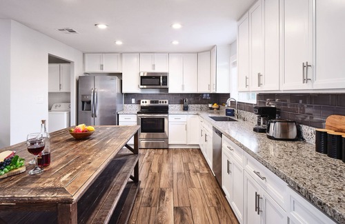 Kitchen: The fully-equipped kitchen has everything you need to prepare a sumptuous meal, featuring stainless steel appliances, basic cooking essentials, and a spacious kitchen island. Savor your meals at the modern dining table with seating for 8, or dine al fresco under the stars in the private backyard accessible through the kitchen area.