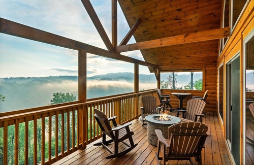Our covered wrap around porch was designed to provide both a great experience and to frame the striking views with our log columns. Combining those views with amenities like our hot tub, bench swings, grill and outdoor dining area plus a fire pit creates an environment where stress just melts away.