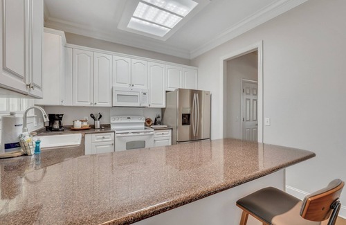 Upon entering, you'll be greeted by an open floor plan, perfect for hosting gatherings with friends and family. The living room is an ideal space to unwind, catch up on your favorite shows after a day of exploring the town, or engage in a lively game night with your fellow travelers. Adjacent to the living room, a formal dining room beckons, conveniently situated next to a well-appointed wet bar, making it an excellent spot for intimate dinners or even a productive workspace. Just beyond, the fully equipped kitchen features stainless steel appliances, ensuring you have all you need to prepare delicious home-cooked meals. A convenient powder room is also located on this floor to accommodate visitors.