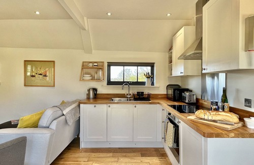 A double door opens into the living area, with open-plan kitchen, dining and sitting room. It offers a log burner and a well-equipped kitchen including dishwasher (along with a washer-dryer in the bathroom). At the other end of this single-storey cottage is the king size bedroom, with a large wardrobe and views over the fields. The bathroom has a double-end bath with rain shower.