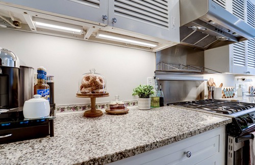 The living room, complete with a wood-burning fireplace and TV, has been outfitted with a chic, full-size bar. Pull up a bar stool and gather with friends for a cocktail or a glass of wine. Or head into the dining room, a true showpiece oozing traditional style. Plan a dinner party or holiday gathering with up to 10 guests in this beautifully appointed space. In the fully-equipped galley kitchen, you’ll notice recessed lighting, high-end appliances, and plenty of cabinetry.