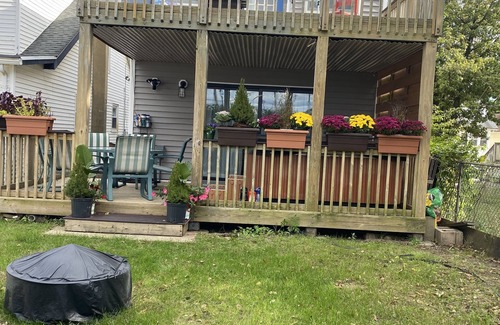 Views of the water park and Dunes in rear. Here you will find three bedrooms, with three modern bathrooms. Handicap accessible ramp, wide entrances in the back and the bathroom. Plenty of room for everyone. Home has two patio decks, cozy fire place on top deck with lounge chairs and tables with six chairs plus a huge hot tub on first floor deck. Bbq grill and fire pit on lawn conveniently located next to the deck on first floor. Inside you will enjoy a clean modern kitchen fully stocked. Five smart TV’s will be available to enjoy in every part of the house. Poker table/ bumper pool and even a retro arcade table will surely be entertaining for guests. High speed, Internet, for those that need to work or stream entertainment. Towels, shampoo, soap & fresh linens are provided. All new mattresses that are super comfortable. Private drive way, with additional off street parking. Centrally located, with access to major highways, NYC ferry and train station. Ring security cameras are placed in front and back of the house by both entry points for your safety. Please no unauthorized guests. 100$ per day per guest /visitors will apply for every unauthorized guest or visitor.