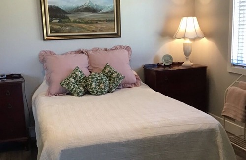 The 1500 square foot free-standing guest house has three bedrooms and two bathrooms. The King bedroom and one Queen bedroom share a Jack and Jill bathroom with double sinks and a walk-in shower. The third bedroom is also a Queen. The second bathroom has a large shower. The home is handicap friendly with a low entry step, walk-in shower, and grab bars.