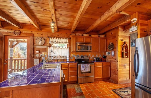The main level of Fly Way Dreams features an open great room, dining area, and kitchen with hardwood floors and vaulted ceilings, leather furniture, a live-edge wooden coffee table, a gas log fireplace with a floor-to-ceiling stone chimney, an HDTV, and a wall of glass doors and windows allowing sunlight in views for the guests. The dining table seats 8 guests, plus 2 more on bar stools at the kitchen island, for a total of 10 dining seats. The kitchen features custom blue tile counters, stainless appliances with a gas cooktop, and custom wood cabinets stocked with all of the essentials to cook and serve meals. A half bathroom/powder room on the main level allows the master suite bathroom to be private. Off of the dining and great room is a large, covered rear deck with mountain panoramas and a view of the picturesque rolling front yard, lined with fiery maple trees. There is a rustic outdoor dining table and numerous Adirondack-style deck chairs on the main level rear deck. It also wraps around the side to offer a quiet porch accessible from the master suite.