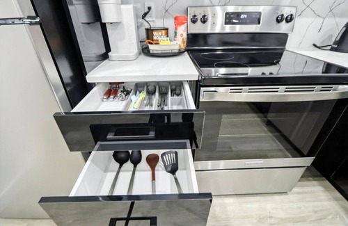 The private suite entrance features 2 queen beds, a cozy living room, and a fully equipped kitchen. Just across the street is a peaceful lake, perfect for morning or evening walks. Enjoy the convenience of a very clean space with essential amenities such as smart 55" TV, bathroom soaps, conditioners, shampoos, clean towels, hair dryer, Free in-suite washing machine and dryer, iron, and WiFi during your stay.